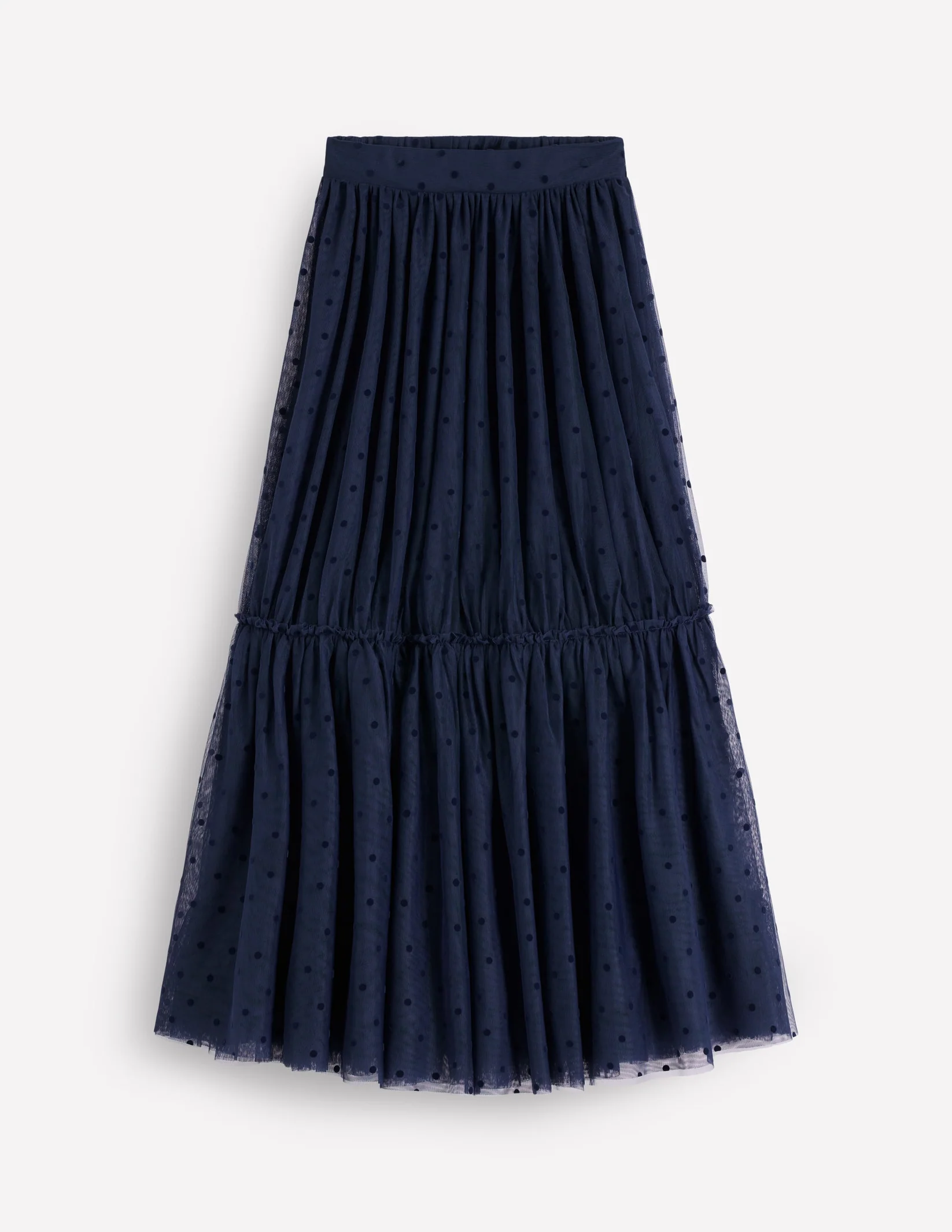 Anna Tulle Midi Skirt Navy Flocked Spot