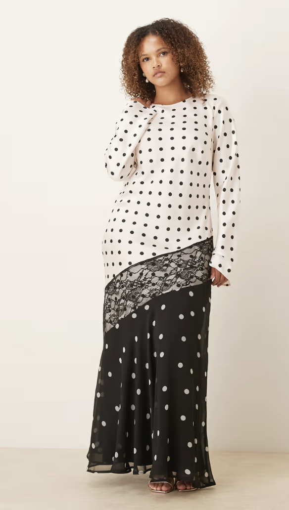 ASOS DESIGN Curve satin maxi dress with lace trim in black and white polka dots