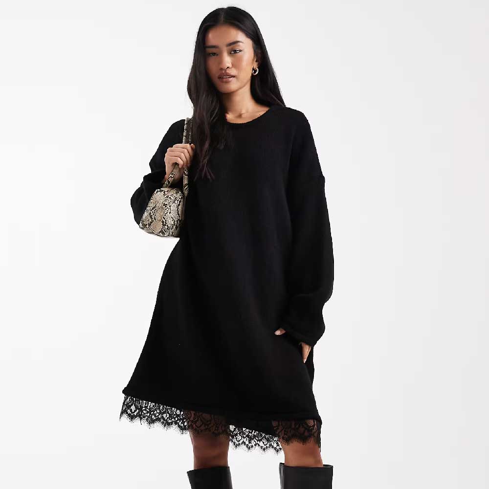 Be the first to review “ASOS DESIGN knit mini dress with lace trim detail in black”