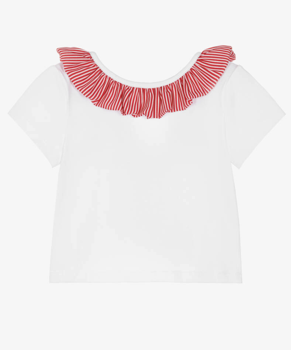 Piccola Speranza Girls White Cotton T-Shirt with Red Striped Ruffles & Bow