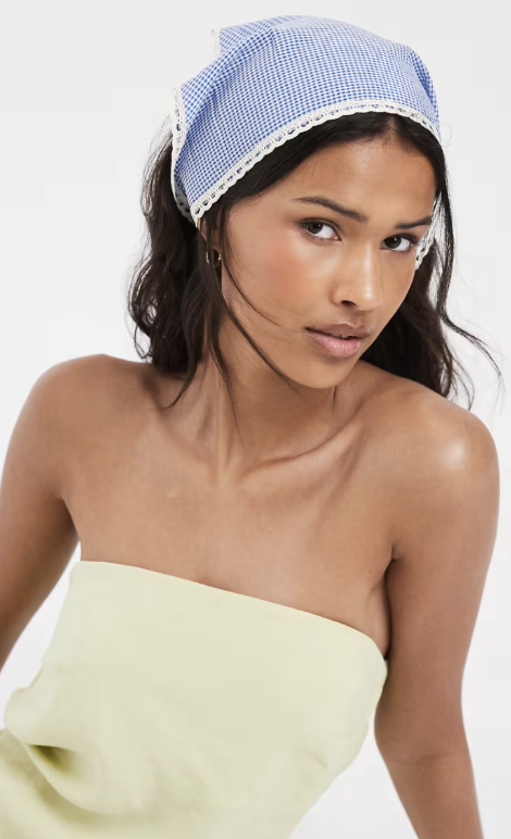 PIECES gingham lace trim headscarf in blue and white