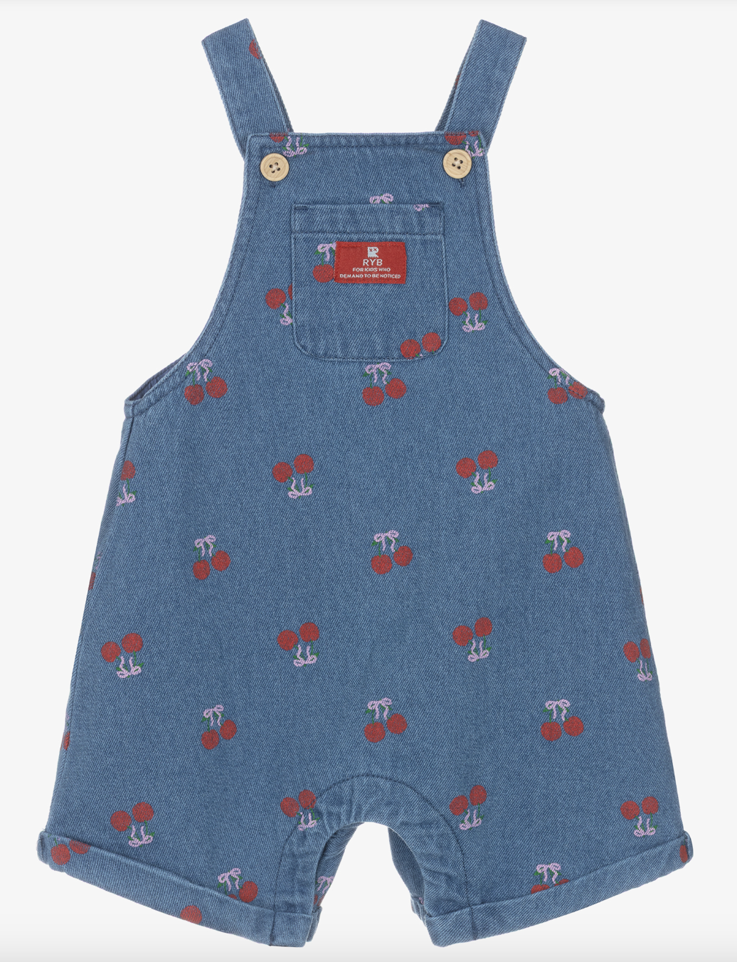 Rock Your Baby Baby Girls Blue Denim Short Dungarees with Cherry Print