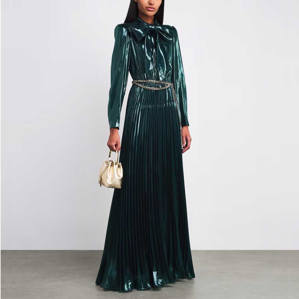Self-Portrait Green Metallic Pussybow Maxi Dress