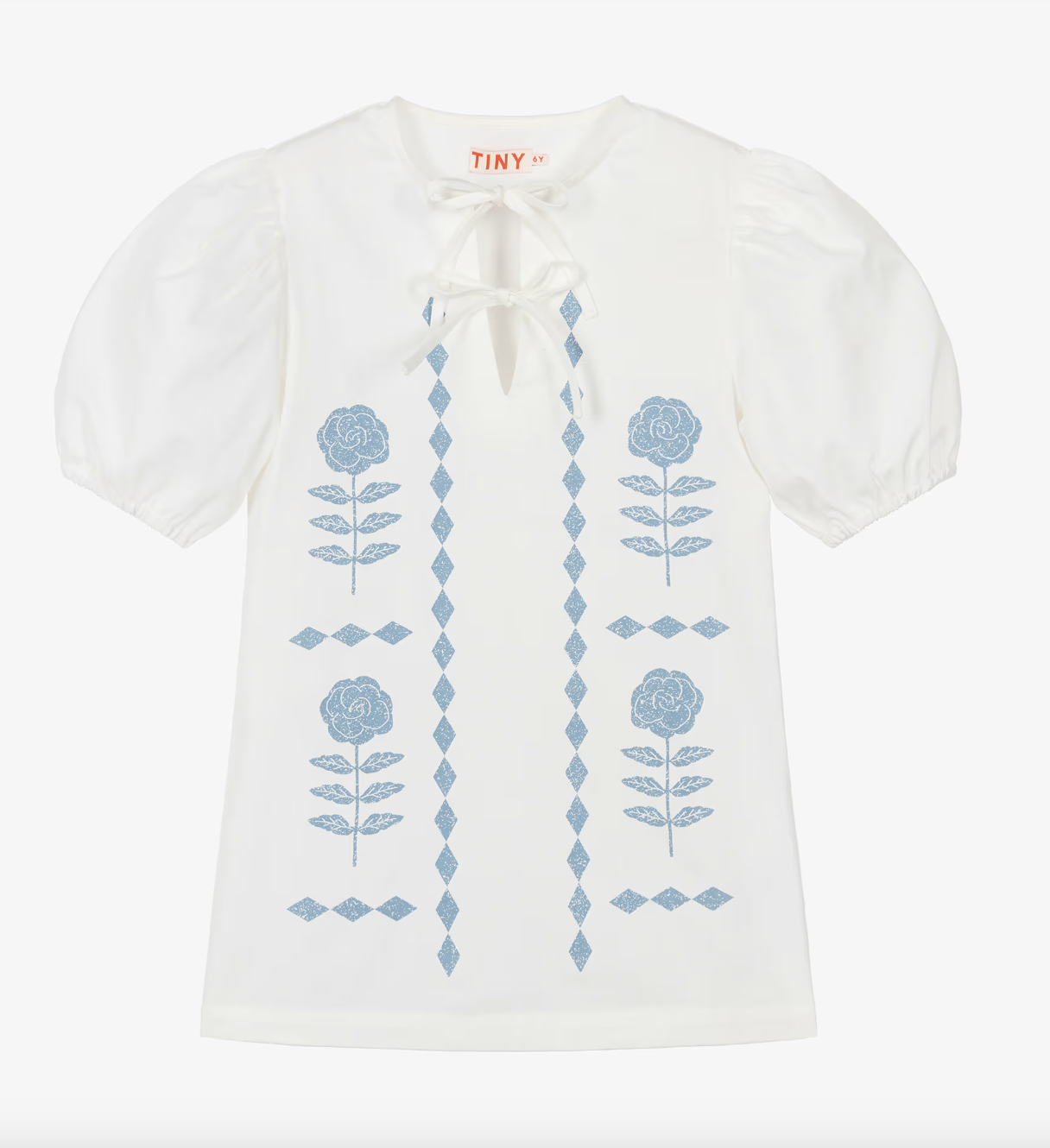 Tinycottons Girls Off-White Puff Sleeve Dress with Blue Floral Print