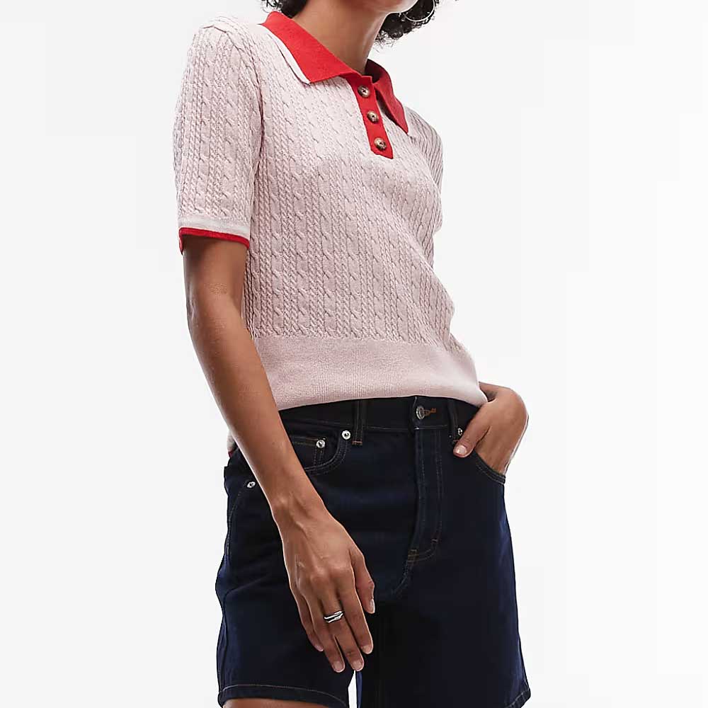Be the first to review “Topshop cable knit shrunken rugby top in pink and red”