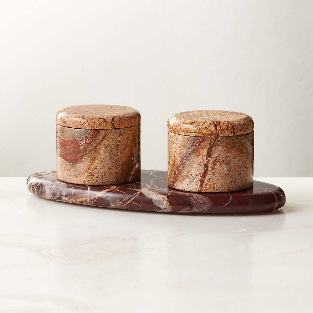 Be the first to review “Zetes Tan and Red Marble Salt Cellars”